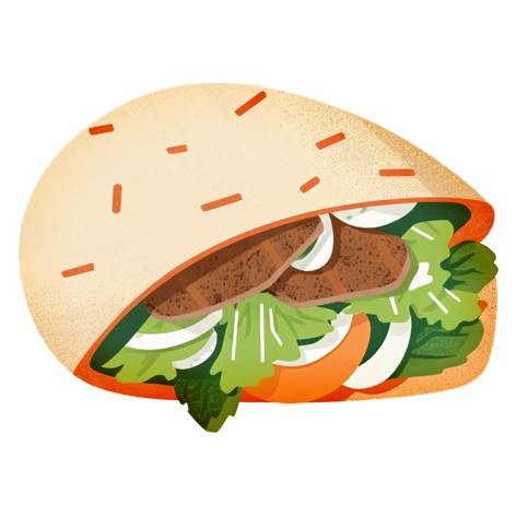 Spiced meat (usually lamb or chicken), lettuce, tomato, onion, and garlic or chili sauce, wrapped in pita or flatbread.