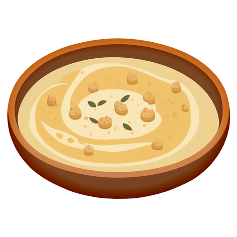A creamy Middle Eastern spread made from chickpeas, tahini (sesame paste), olive oil, garlic, and lemon juice. Hummus is popular as a dip, sandwich spread, or side dish, known for its smooth texture and nutty, tangy flavor.